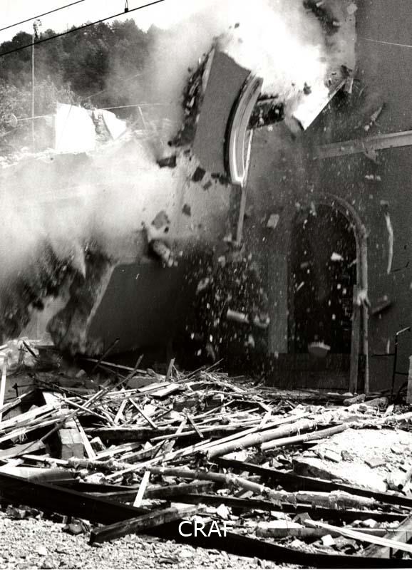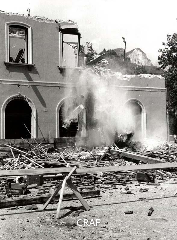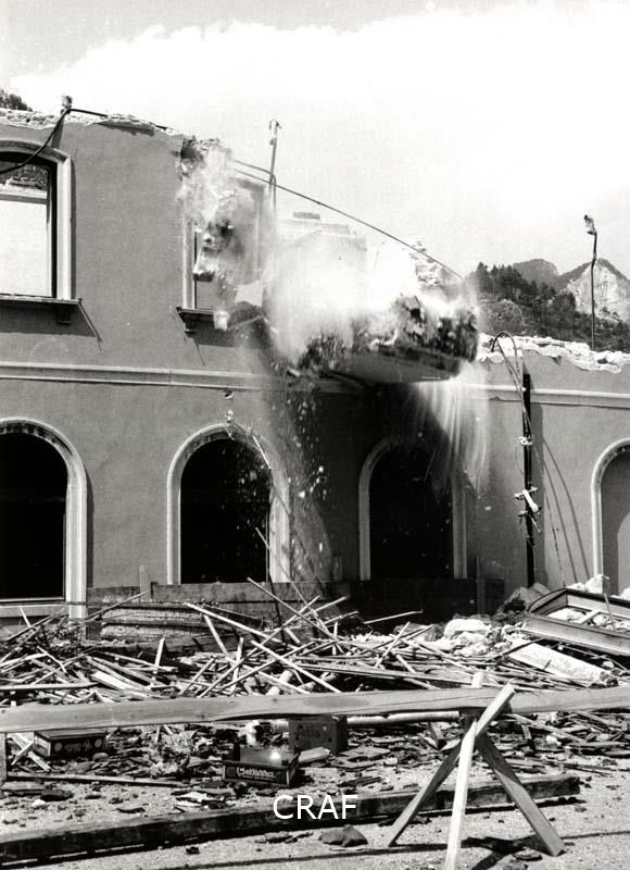 Momento di crollo di una parte dell'edificio della stazione ferroviaria di Moggio Udinese