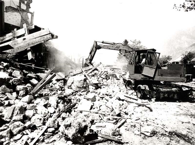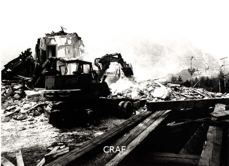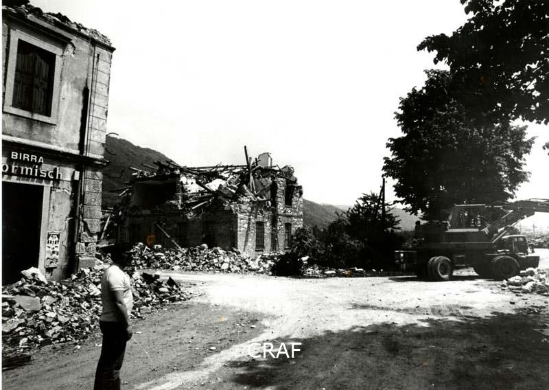 Escavatore al lavoro tra le macerie della stazione ferroviaria di Artegna